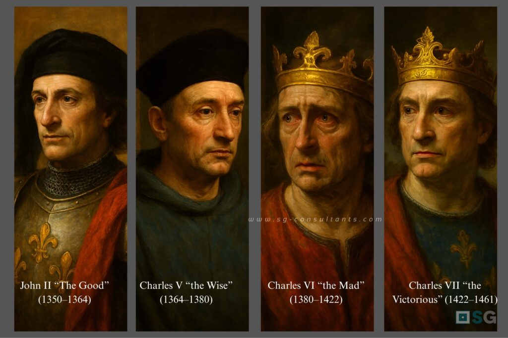 An AI-generated oil painted rendition of French monarchs during the ‘Hundred Years War’. The attribution of epithets to their names suggests distinct ‘governance styles’ shaped by their choices and achievements.