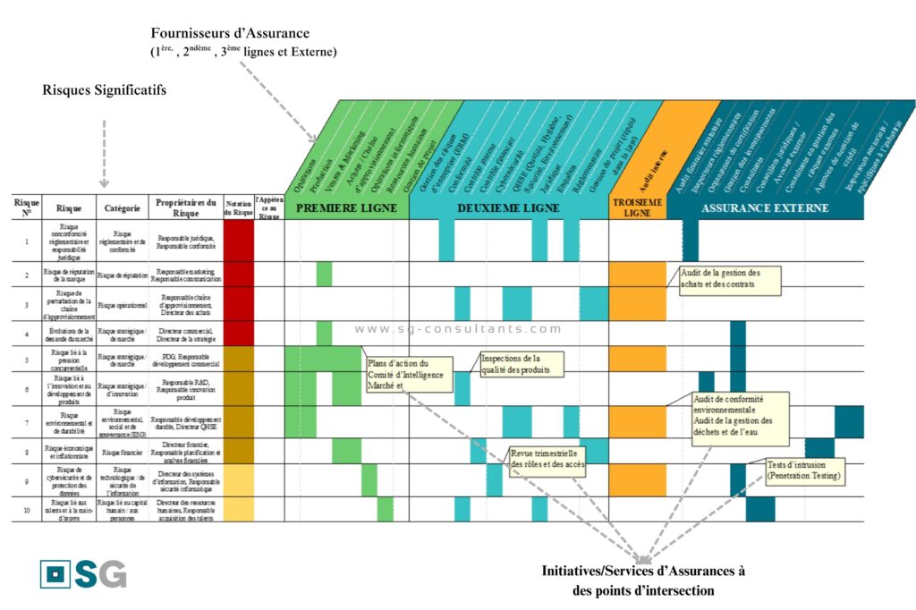 Une matrice d’assurance des risques est un outil puissant permettant de coordonner les efforts d’assurance à travers l’organisation. Elle confronte, visuellement, les expositions aux risques significatifs (sur un axe) et les fournisseurs d’assurance (sur l’autre), offrant une vue claire de qui fournit une assurance sur quoi, et où se situent les lacunes ou les chevauchements.